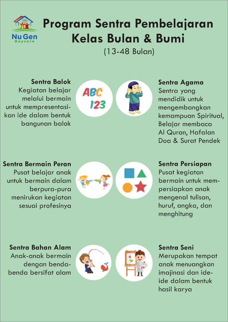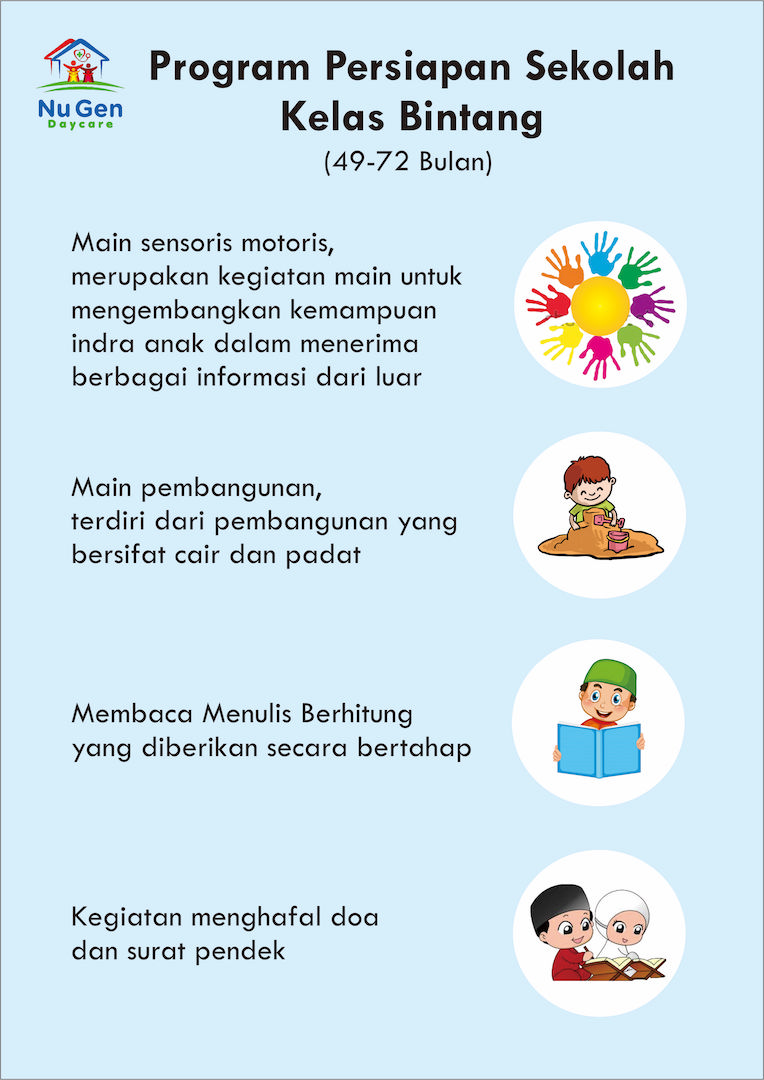 Di Nu Gen, setiap anak diajak belajar dengan pendekatan Fun Learning yang menyenangkan dan terintegrasi penuh dengan sistem Nu Gen. Program ini dirancang untuk menyiapkan anak menuju jenjang Sekolah Dasar, sambil tetap memperhatikan minat, keunikan, dan tahap perkembangan anak sejak dini.